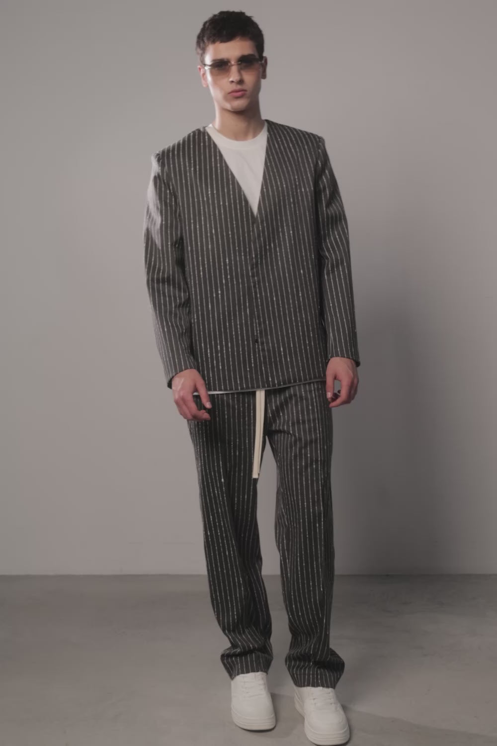 Designed with an elasticated waistband, these trousers move away from casual styles and into a more architectural, refined territory. The clean front, precise seams, and rich grey tone make them a versatile foundation piece—ideal for both elevated everyday wear and statement styling.