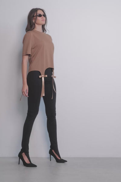 Elevate your casualwear with the chocolate oversized for women "Charme" T-shirt from Atelier Hamza, designed with a subtle touch of charm and individuality. This statement piece features a relaxed silhouette with dropped shoulders and a soft crew neckline. What sets it apart are the hand-applied satin bows at the hem—delicately crafted to add a feminine finish to the minimalist design.