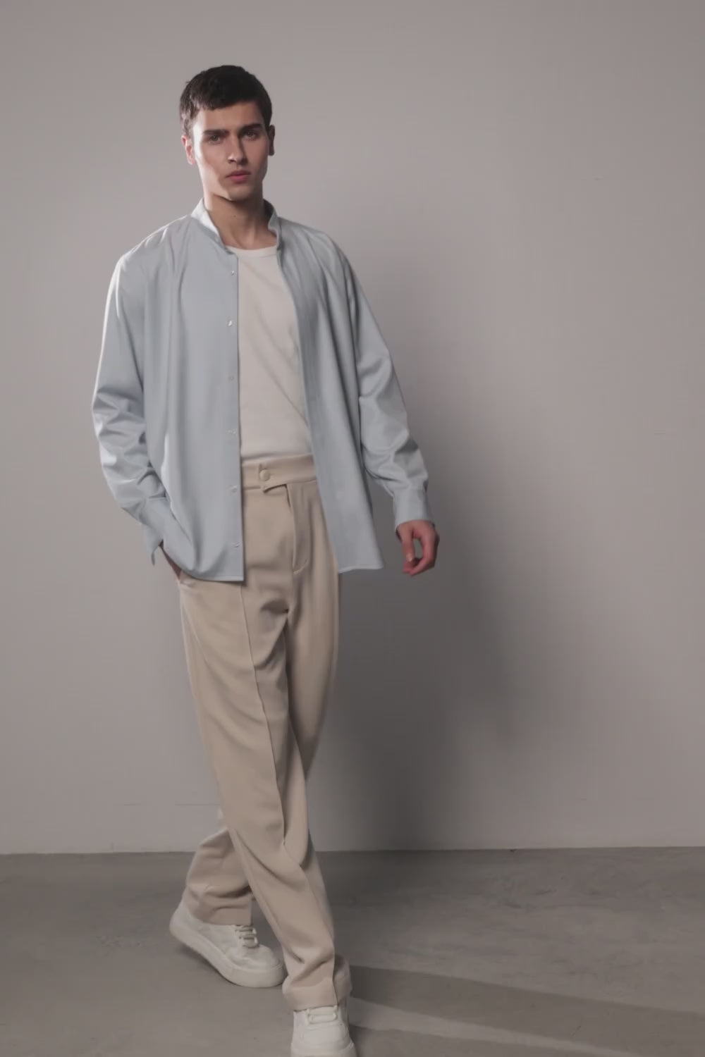 The low band collar gives the piece a contemporary character, while the concealed button placket — created through a double-layer front construction — keeps the design sleek and uninterrupted. Long sleeves and a relaxed yet tailored silhouette make it an elegant choice for both casual and refined styling.