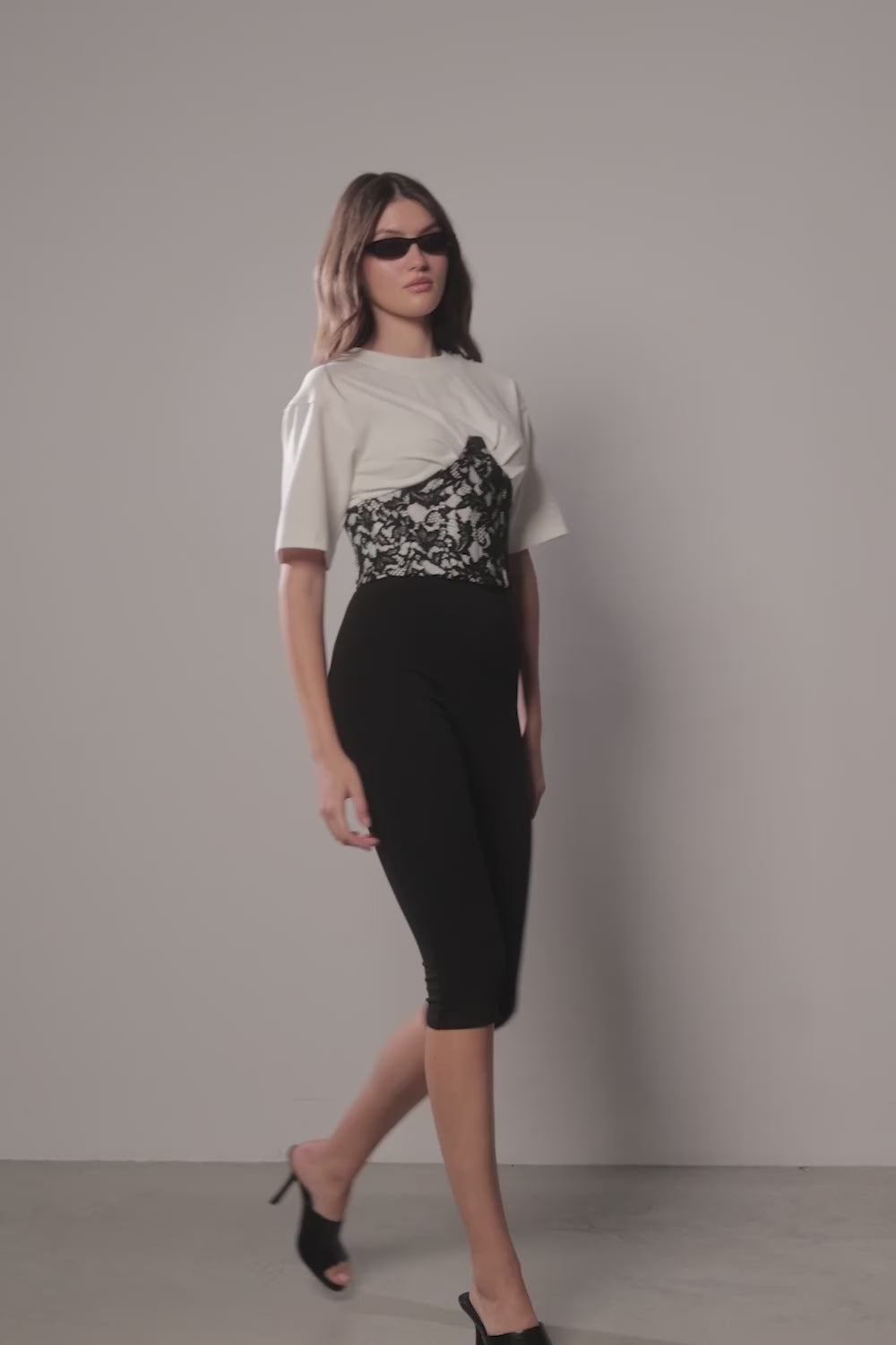 Ta wyrafinowana koszulka wyróżnia się niezwykle szczegółowym nadrukiem przedstawiającym gorset ozdobiony diamentami i żywymi detalami, dodając nuty vintage’owego uroku Twojej garderobie. Misterny projekt idealnie prezentuje się na śnieżnobiałej tkaninie, tworząc stylowy, przyciągający uwagę wygląd.