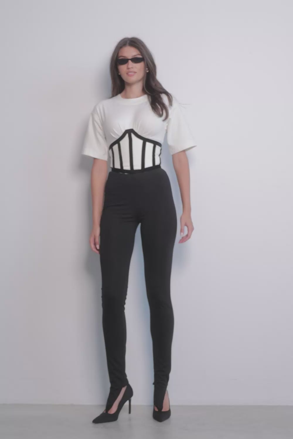 Ta wyrafinowana koszulka wyróżnia się niezwykle szczegółowym nadrukiem przedstawiającym gorset ozdobiony diamentami i żywymi detalami, dodając nuty vintage’owego uroku Twojej garderobie. Misterny projekt idealnie prezentuje się na śnieżnobiałej tkaninie, tworząc stylowy, przyciągający uwagę wygląd.