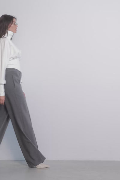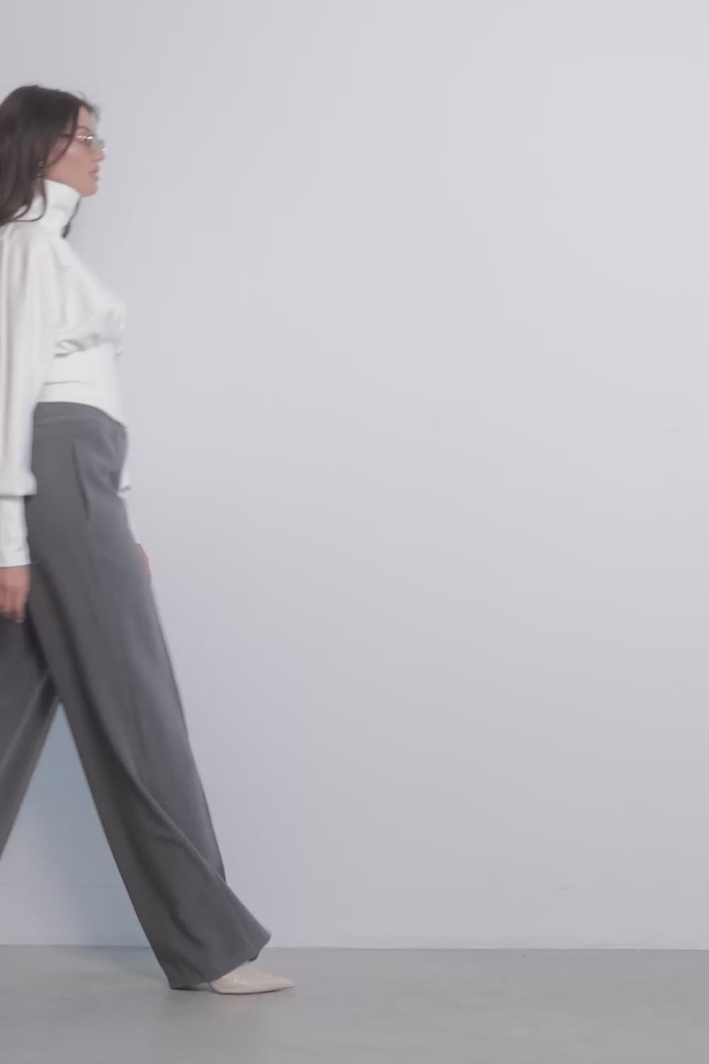 Wysoki dekolt nadaje elegancki wygląd w stylu golfu, podczas gdy luźniejszy krój w górnej części płynnie przechodzi w bardziej dopasowaną talię, podkreślając kobiece kształty i tworząc nowoczesną, harmonijną sylwetkę. To wszechstronny model, który doskonale sprawdzi się zarówno na co dzień, jak i na bardziej formalne okazje.