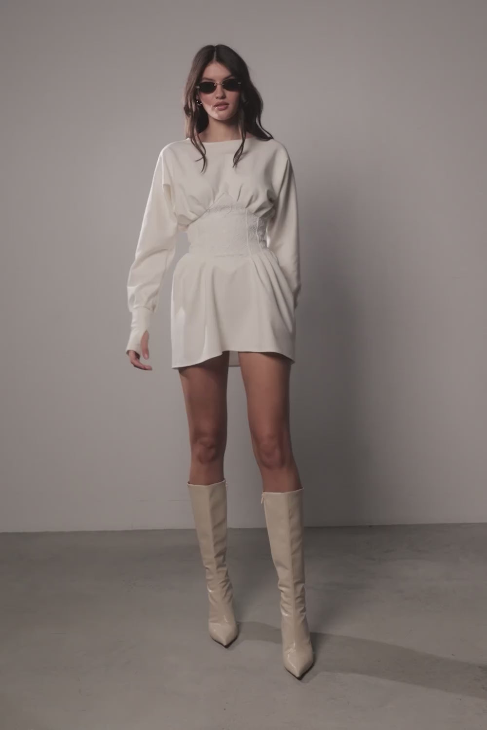 - Elegancki detal gorsetowy – Dopasowany gorset w talii z ozdobnym wiązaniem zdobionym kryształkami, tworzący piękną, podkreśloną sylwetkę.