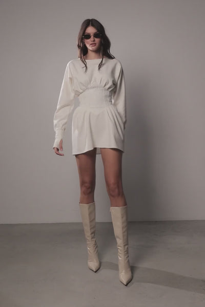 Wysoki dekolt nadaje elegancki wygląd w stylu golfu, podczas gdy luźniejszy krój w górnej części płynnie przechodzi w bardziej dopasowaną talię, podkreślając kobiece kształty i tworząc nowoczesną, harmonijną sylwetkę. To wszechstronny model, który doskonale sprawdzi się zarówno na co dzień, jak i na bardziej formalne okazje.
