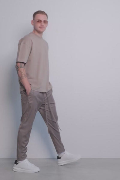 The elastic waistband at the back and adjustable fabric drawstrings ensure a flawless fit, while the smooth, structured front maintains a refined look. A central seam and Hamza’s signature detail provide a subtle yet distinctive finish.